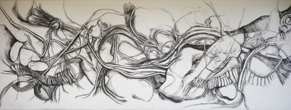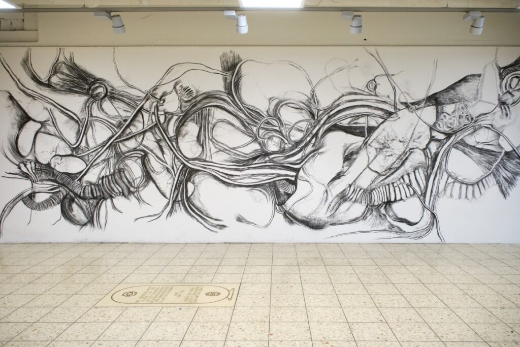 Oberdorfmärit: Irina Moser, Improvisation, 2025, Kohle auf Wand (Cantonale Berne Jura 2025)